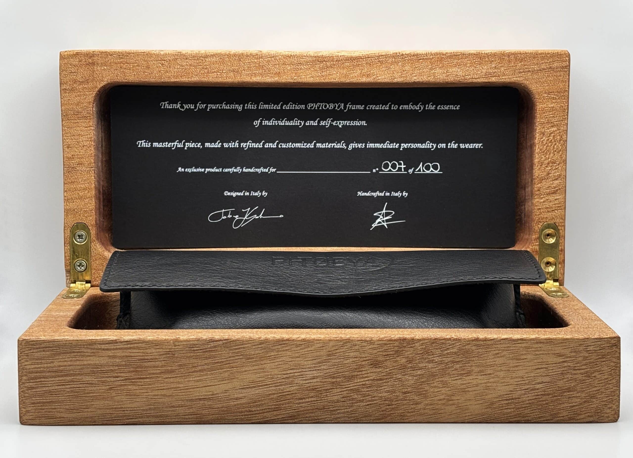 Infine, per proteggere e custodire ogni occhiale, è inclusa una custodia in legno pregiato, che aggiunge un ulteriore livello di eleganza e distinzione, rendendo l’esperienza di possedere questi occhiali unica e irripetibile.
