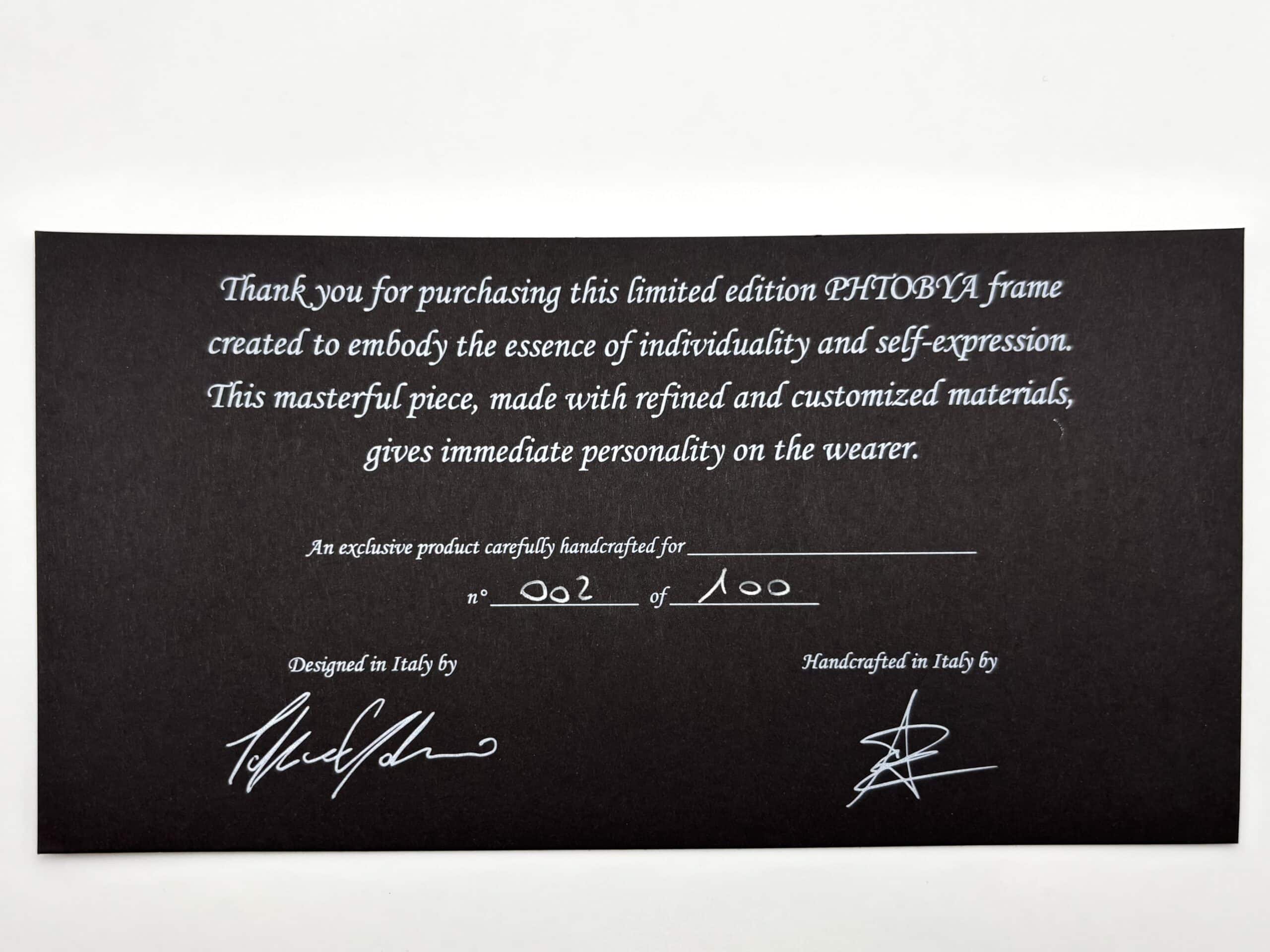 Phtobya è un marchio italiano che rispecchia l’eleganza senza tempo e l’artigianalità di livello. Ogni montatura è realizzata con una lastra in acetato giapponese da 16 mm, scelta per la sua resistenza e luminosità. Le viti e le cerniere, interamente disegnate e prodotte dal brand , riflettono l’attenzione al dettaglio e la cura del design, conferendo a ogni occhiale una perfezione unica.